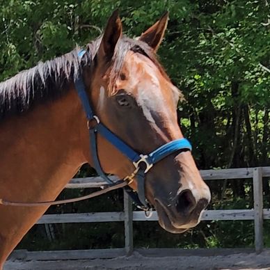 Freddie is a 9 year old thoroughbred bay gelding who was fortunate enough to find us just before he was sent to slaughter from his racing home in Florida. Here at Blissful Dreams, Freddie became fast friends with Glee and Myrth. Other than his training on the race track, Freddie came to us not knowing much of anything else. After months of hard work and re-training, Freddie has become an essential part of the program, with riders of all levels for which he now serves. He has become a favorite of everyone, with his sweet personality and giant heart.