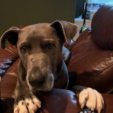 Bleu is a 5-year-old pit-bull mix that was rescued in May at the Spartanburg Humane Society by Sam. She found him while volunteering in May 2023 and found out he had been at the humane society since September 2021 with not much interest. He loved and connected with Sam in a way that he didn't with the staff, and that solidified him being the one. He has come out of his shell a lot and is slowly learning to trust others.