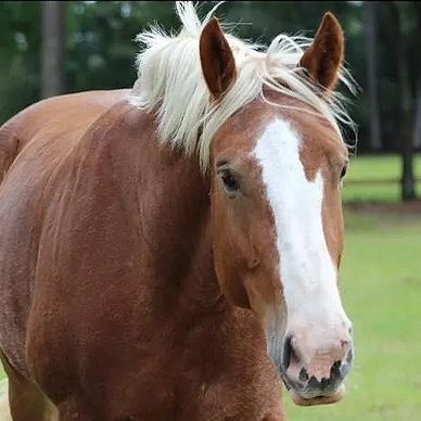 Waffle is now a 18-year-old 17.0 hand Belgian draft mare that was a 5-year-old Alpharetta, GA girl advertised on Craig’s list when we found her. She was basically just a backyard pet and had never been ridden before. When she arrived at Blissful, she was absolutely terrified of the ducks in the pond. She not only overcame her fear of ducks but also learned how to jump, which turned out to be one of her favorite things to do. Waffle is the big gentle giant of the barn that loves to give kisses for treats.